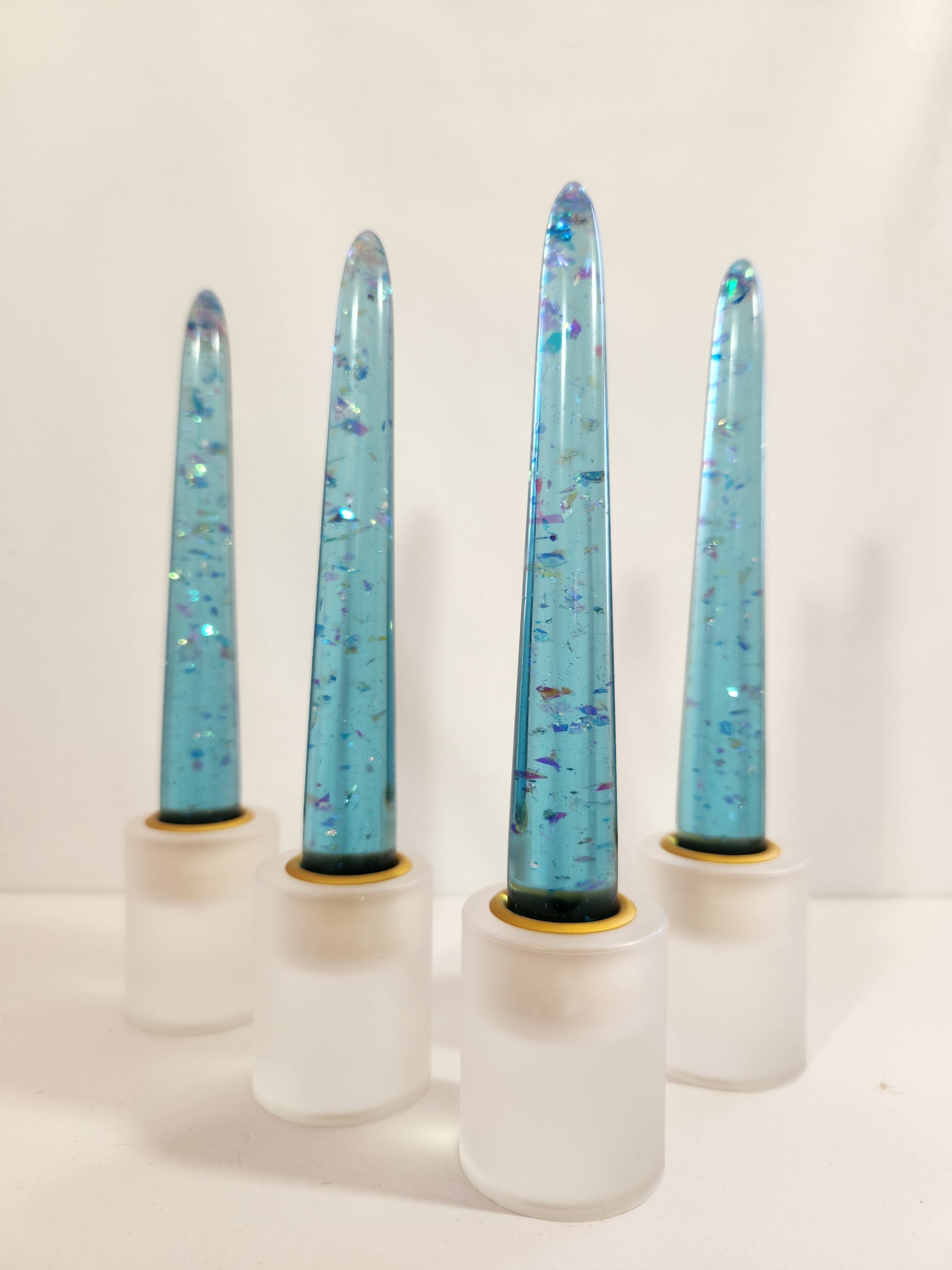 Candle sticks are hand cast, molded, and polished. Multi-color iridescent polyester flakes. Various color options available. Sold in Pairs.